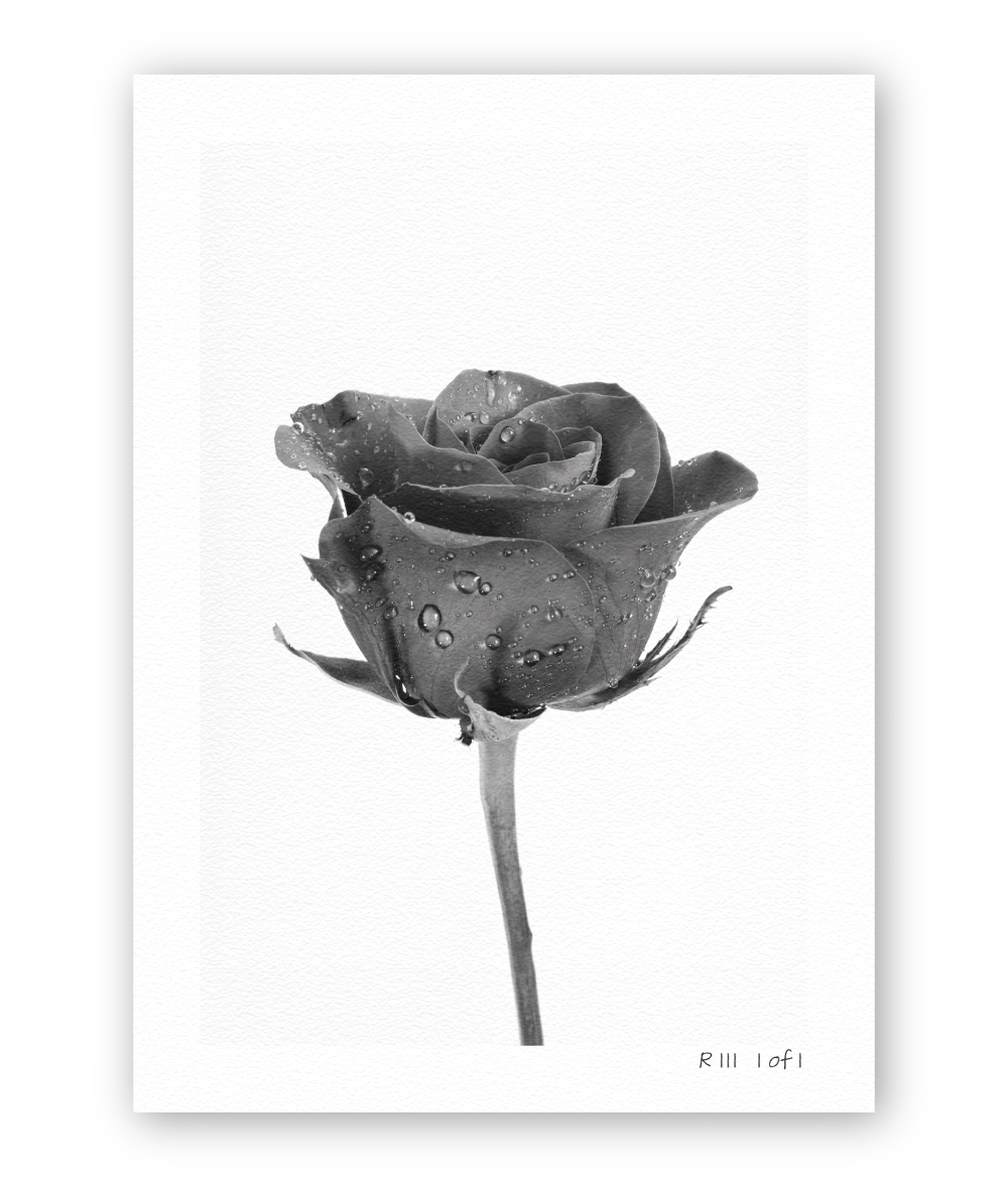 Washed in light, each droplet rests like glass upon the petal’s surface. The rose stands suspended between shadow and shine — quiet, elegant, and eternal.